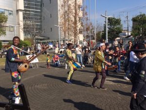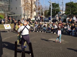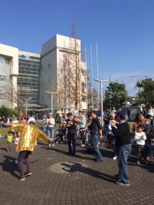 「みなさん、一緒に踊りましょ~!」ラウラウの掛け声に、はじめはモジモジ恥ずかしそうにしていたお客さん達が、だんだん踊りだしました。踊ります踊ります♪岡津囃し連のおじ様が金色の羽織に扇子で、一番に踊り始め、他のお客さんを先導してくれました。