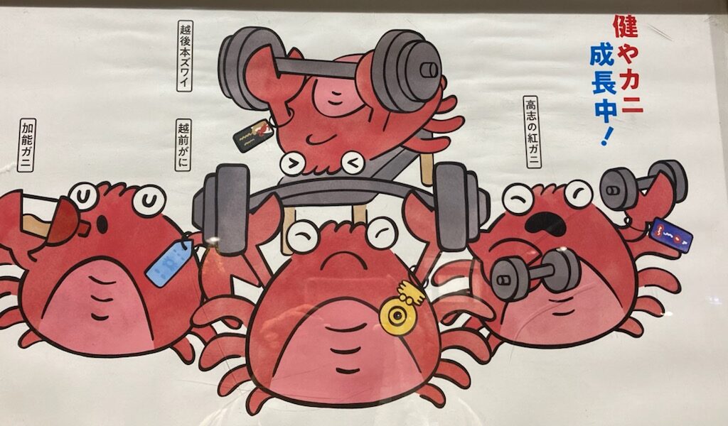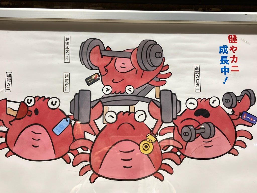 カニダンベル持ち上げたり栄養ドリンク飲んでたり、筋トレに励んでいる🦀カニさん達がそれぞれぶら下げているお守り?タグみたいなものが何なのかは謎のまま。ただ、いろんな種類のカニさんということが紹介されていました。越前本ズワイ・越前がに・加能ガニ・高志の紅ガニ。調べてみたら、脚にタグがつけられているカニさんはブランドガニと呼ばれるものらしいですガニ~🌟