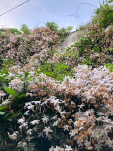 もう、かれこれ15年ちかくかな?・・・この季節にそこを通るたびに、どこからともなくジャスミンの香りがふわぁ~っと風に乗って香ってくる場所があるの。💖他にもジャスミンの香りが香るスポットはいくつかあるけれど(毎年のお楽しみスポットたちなのだ😍)、どれも香りの源のお花もどこにあるかちゃんと見えるんだけど、このスポットだけは、いったいどこから香ってくるのかわからなくて、、、🙄(´ε`;)ウーン…