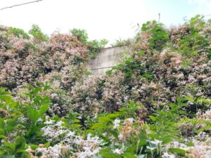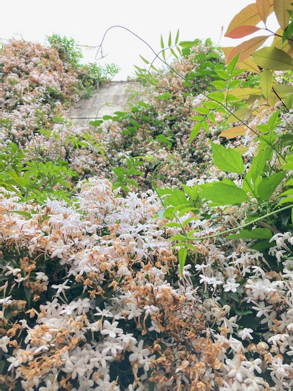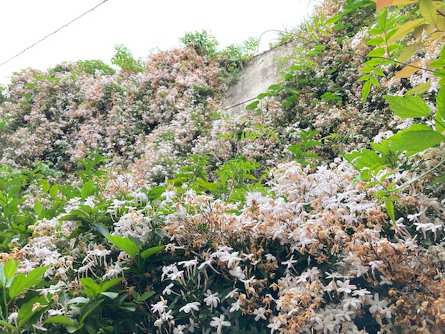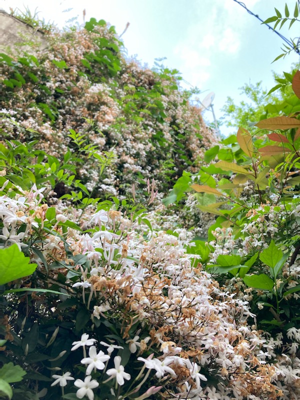 もう、かれこれ15年ちかくかな?・・・この季節にそこを通るたびに、どこからともなくジャスミンの香りがふわぁ~っと風に乗って香ってくる場所があるの。💖他にもジャスミンの香りが香るスポットはいくつかあるけれど(毎年のお楽しみスポットたちなのだ😍)、どれも香りの源のお花もどこにあるかちゃんと見えるんだけど、このスポットだけは、いったいどこから香ってくるのかわからなくて、、、🙄(´ε`;)ウーン…