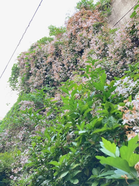 今年は風の具合なのか、お花の咲き具合のタイミングがちょうどよかったのか、香りがいつも以上に強くてはっきりと、しかも長い時間感じられたので(いつもはちょっと間あっちから香ったり、今度はこっちから香ったり、香りが薄くなったりして、振り回されていました)、🐶💡✨家族が「こっちから香りがしてこない?」と言い出してからも同じ方向からずうっと香ってくるので、冒険者になった気分で源を探して歩きはじめました。入ったことのない横道にキョロキョロしながら入ってゆっくり進んで行くと、ちょっとだけジャスミンが見えました!「あった!!!🌟ここだったんだ!!!」コーフンして奥に進んで行ったら、突然景色が開けて・・・・・・「え・・・😲異世界に迷い込んだ???」かと思った。。。建物?全体がジャスミンにおおわれて、まるでジャスミンのお城みたいな、ジャスミンのラピュタみたいな・・・あたり一面がジャスミンの香りに包まれた空間のなかで、しばし呆然と立ち尽くしてから、はっと我に返り、写真を何枚か撮って、いつもの道に戻りました。戻れないかと思うくらい、別世界に迷い込んだ感じでしたなり。家族で最高にコーフンしながら、幸せいっぱいな気持ちで寝ましたとさ😊東京は、今がジャスミンの開花時期なんじゃないかな?急にあちこちで咲き始めていい香りがするよん💖