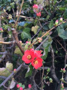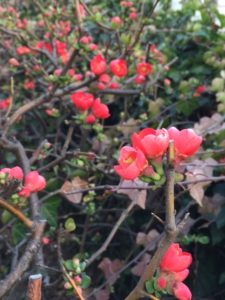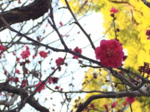 そのかわり、去年”こすず”を助けたあたりで、たくさんのまるまるしたすずめ達を見かけましたなりん。(もしかしたら、この中に大きくなった”こすず”がいるかも、、、きっといる!こすずや~い♪もう大人になって恋人見つけたのかなぁ~)立ち止まって見あげていると、最初はちらちらとこちらを気にしながらも木の上でたむろっていたすずめ達だったのに、荷物積み込み中の車のガタン!!!ていう大きな音に驚いて、そのまま飛んでいっちゃった。。。それから、小鳥がたくさん訪れる神社にも寄ってみました。もう満開を迎えている白い梅の花や、紅い梅の花にも遭遇。眼福眼福。木々の間をいろんな野鳥が飛び回っていました。姿はあまりわからなくて声メインだけど、自然のなかに包まれている感で、パソコンで疲れた眼が癒されました~~。「梅の花のかおり」なるものが、よく小説に書かれているのでくんくんしてみたけれど、残念ながらわからなかった。。。(’。’)最後にみつけたのが、木瓜(ボケ)の花。(だと思う)”こすず”を知らない人、よかったら、 Blog「こすずちゃん救出大作戦☆ピッ♪」を見てね(^^)
