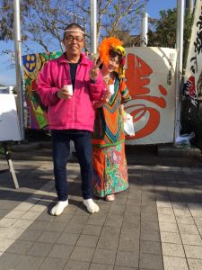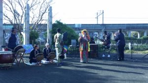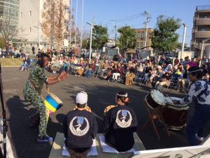 「岡津囃し」から始まったステージは、まず、可愛らしい獅子舞達とひょっとこ達のパフォーマンス。外国人のお客さんも大喜び。そして、巴紋様の描かれた立派な六尺太鼓を中心にでんと構えた和太鼓の演奏。岩手県金ヶ崎市の金ヶ崎国際交流協会のアフリカイベントでも地元の「清流太鼓」の皆さんがダンッ!と全員で音をだした瞬間、快感サウンドが背中を駆け抜けたけれど、今回は屋外。どうかな?と期待にわくわく。