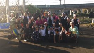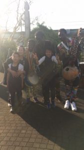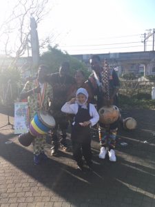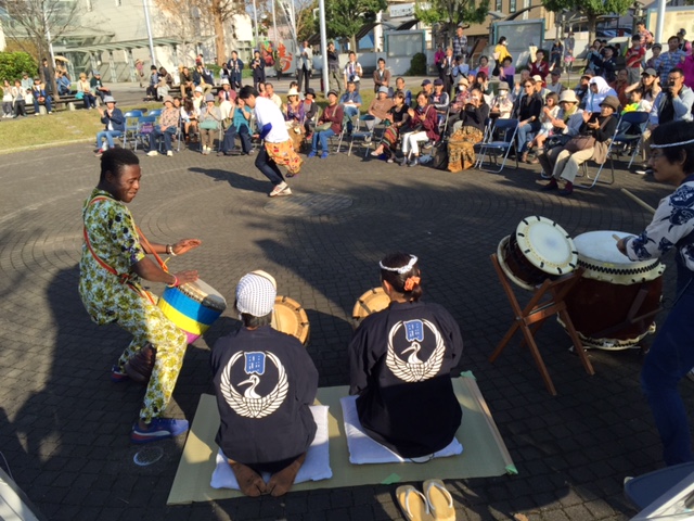 まさに音楽は国境を越える!ソロまわしの掛け合いも盛り上がりお客さんは手拍子で参加。最後はお客さんも全員リズムに乗って踊って、日本(泉区)とアフリカが青空の下でひとつになりました♡岡津太鼓の副代表(写真の右端の若手男性)は、終わった後「いやぁ~~、すっごく楽しかったデス!本当に楽しかった!」とニッコニコでした♡彼とラウラウの掛け合いは凄かった~♪