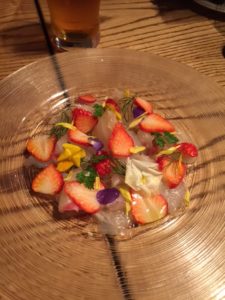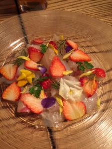 2019年4月20日 / 最終更新日時 : 2019年4月20日 mari BLOG 美味し可愛ゆし春のひとさら♡ あんまりきれいで可愛らしかったので、つい写真をとってしまいました♡なんのお料理でしょう?薄くスライスした苺、最後に散りばめられたエディブル・フラワーの色が紫と黄色と白というのも、意外で、特に紫と黄色のコントラストがお料理より花束風に感じましたなりん。 正解はカルパッチョで~す♪たまには、腕によりをかけたプロが作るお料理を頂くのも、新鮮な驚きがあって、楽しいものですね(^~^)春らしい見た目に、薄いスライス苺の甘味が、思いのほか、カルパッチョの酸味と合っていて、美味でした♡♡♡