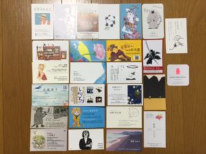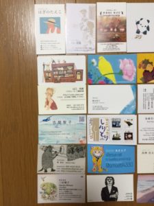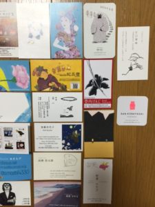 印刷された段階で色が微妙に変っていたり、題や作家名が入るので、絵の雰囲気が変っていたり、、、とってもユニークな企画だなぁと思いました。次回もぜひ見に来たい!作家さん各々の作品のファイルも置いてあって、それを見るのも楽しい。原画は各作家さんが1枚だけ出展だったけど、ファイルでかなり楽しめたもん♡ご自由にどうぞ名刺を貰ってきちゃった♡♡♡さて!2時頃、ギャラリーに行くと山本さんがいて、ハグハグ~。話題になっている新シリーズ「おいらん若君」の3巻の表紙の原画があり、表紙とは全然違う繊細な質感や迫力に見惚れてしまった・・・