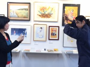 きょうのグループ展はギャラリー・ダズルの主催で、2018年~2019年初頭に出版された、様々な書籍の装画(表紙絵)の原画+書籍を展示するという企画。本屋さんで見たことがある絵がたくさん。壁に飾られた原画の美しさや質感や迫力を鑑賞するでしょ?その後に目線を下げれば、そこにはハードカバー本や文庫本が置かれていて、今見た原画が表紙になっているの。見比べることも出来て、とっても興味深かったでっするん♪