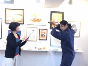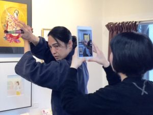 最初の奇妙な写真の右手上方に飾ってある金色っぽい昨品がソレです。写真撮るのわすれてしまった。なぜなら!・・・・・ひとしきり山本さんと原画を見ながらお話ししていたら、GoldCastleの金山孝之先生が登場!再会の挨拶が終わったとたんいきなり「それで、この構えの時なんだけど、指がこうなってこうなって」といきなり実演開始!山本さんも熱心に撮影開始!なんじゃこりゃ?!木刀も模造刀もなくて持ち手の説明がわかりにくそうだから、思い立って渡すつもりだったAFY2019のパンフレットを丸めて渡すと「あ、どうも」と2人ともマジなまま、剣術のポーズの打ち合わせ続投。このようにして、「おいらん若君」の表紙絵は、プロの剣士のアドバイスを取り入れながら完成していくんだそうです。だから、クレジットにカバー剣術指導:金山孝之 とあるんですね~なるほど(:。:)役者経験もあり、自ら動画制作もする金山さんならではの視点や感性が、見事に生きていて、ヒジョーに刺激になる制作打ち合わせ現場を目の当たりに出来てラッキーでした♪山本さんから、直前に