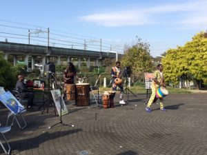 ロロちゃんも、曲ごとに細かくサウンドを調整して演奏を後押し!何回もメンバーがロロちゃんの方を嬉しそうに振り返ってアイコンタクトするシーンがあったよん♪初めて会うメンバーだけど、気持ちはひとつだぜい♡ああ、写真見て?青空と太陽の光が似合うでしょ?後に見えるのは相模線の線路。まり的にはステキな広場の設計通りにデザイン柱と緑をバックに演奏したかったけど、少しでも外にいる人から見えるようにという区役所スタッフの作戦をきいて納得☆