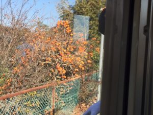 発見したのは、柿の実が景色の中ですごく目立つこと。ところどころに、パッと目をひく柿の実が・・・でも写真を撮ろうとするともう景色から消えていて、カメラを構えて待っていると全然登場しなくて、ロロちゃんがゲラゲラ笑ってた。この写真が唯一撮れた柿の写真デス(^^)自然の植物や動物の智慧はやっぱりスゴイ。青森の五所川原に行く電車の車窓からも、クリスマスツリーの飾りみたいのりんごの実が木になっているのが遠くからでもわかったけど、柿も同じなんだね。ふむふむ