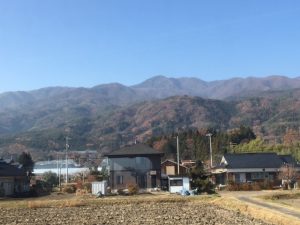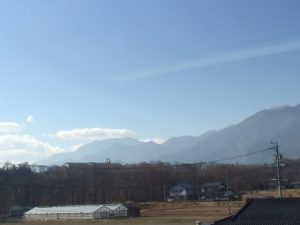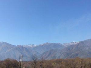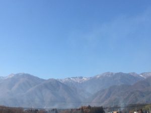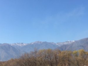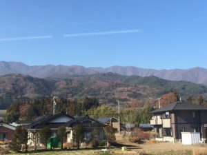 しばらくずうっと、広い青空と山々、手前には秋の自然の風景でした。残念ながら、連なる山々の名前はわからずじまい。でも、いい!