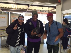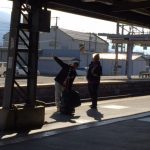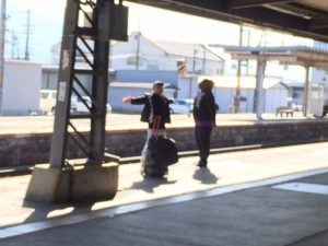 電車待ちのMari達には空気はキンキンだけど、太陽がぽかぽかして気持ちいい。写真はピンぼけだけど、ホームで日向ぼっこするコータンとロロちゃん。続いて改札口手前でGuys3人。