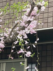 これがきょう編み出した新しい技なのでありマッスル。ただ、ひとつだけ、注意点があります🚥🚥🚥片手onlyで普通の持ち方から、この持ち方に持ち換える時に油断すると、突風で傘が踊って柄が、うつ向いていて無防備な頭に激突しますです。実は、きょうMariが体験しまして・・・左手onlyで持ち換えている最中にババッと吹いた突風に煽られた傘の柄がゴチンと頭に当たり、👱Komantaleboo?(コマンタレブー=ごきげんいかが?)TANKOBU~~タンコブー(たん瘤)🤣💦💦💦が出来ちゃったのでありました、チャンチャン🙆🎶今年会うさいごの🌸サクラかな?透明感のある枝垂れ桜を見かけたので、パチリ📸みんなにも紹介しまーす。