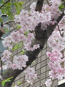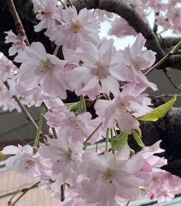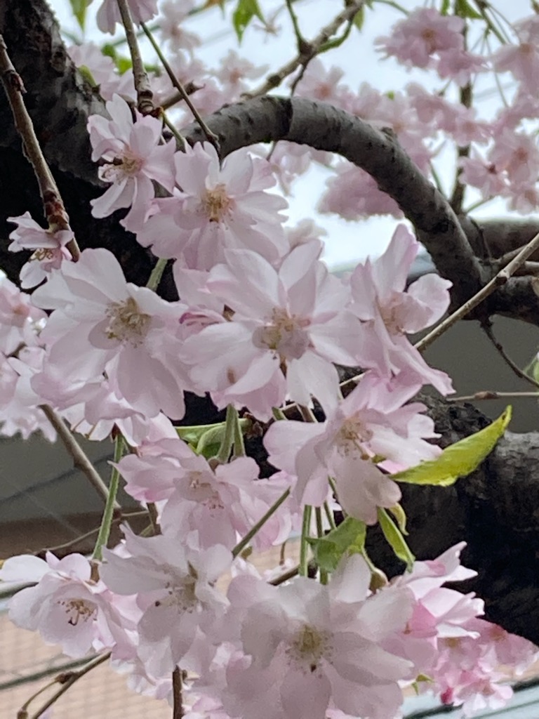 これがきょう編み出した新しい技なのでありマッスル。ただ、ひとつだけ、注意点があります🚥🚥🚥片手onlyで普通の持ち方から、この持ち方に持ち換える時に油断すると、突風で傘が踊って柄が、うつ向いていて無防備な頭に激突しますです。実は、きょうMariが体験しまして・・・左手onlyで持ち換えている最中にババッと吹いた突風に煽られた傘の柄がゴチンと頭に当たり、👱Komantaleboo?(コマンタレブー=ごきげんいかが?)TANKOBU~~タンコブー(たん瘤)🤣💦💦💦が出来ちゃったのでありました、チャンチャン🙆🎶今年会うさいごの🌸サクラかな?透明感のある枝垂れ桜を見かけたので、パチリ📸みんなにも紹介しまーす。