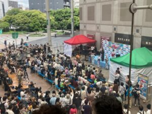 この30分間のイベントは、スーパーのプライベート・ブランド商品をいくつか紹介することと、この日かから開催される夏のセールの宣伝がメインだったんだ~~と思います。会場は写真のようにパイプ椅子で客席があって、後方ど真ん中には平台の上にカメラや音声を構えた取材の報道関係者がスタンバっていました。そしてその外側がカラコンで仕切られて入れないようになっていて、内側のイス席は整理券?を持っている人のみが入れるスタイル。それ以外の人は仕切りの外で、自由にステージを観られる。。。という形でした。赤と緑のテントの間に見える小さなステージは健さんが登場する場所。2階から双眼鏡で観ることにしました👋😄