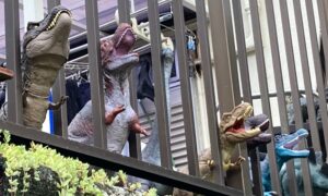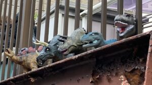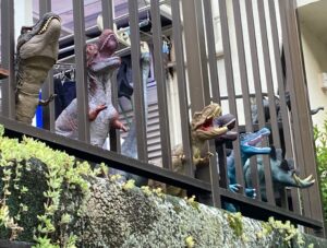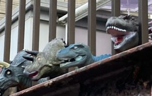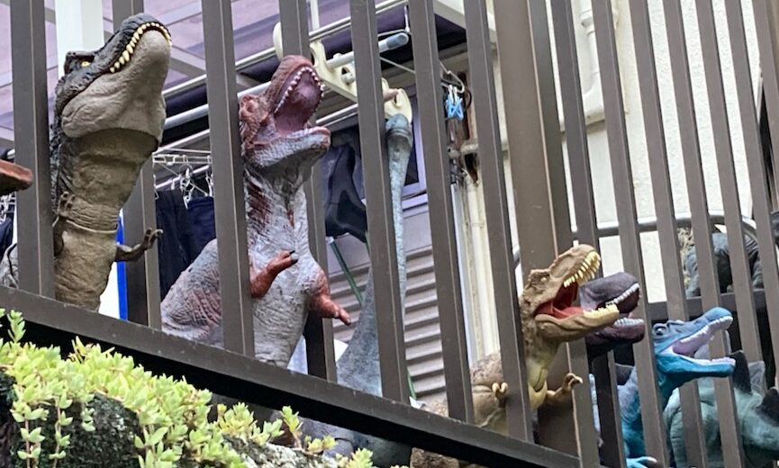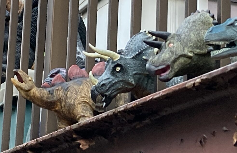 この姿勢、ポーズも置き方もめちゃくちゃユニークでしょ?😁最初の写真の側の恐竜たちは陽気な表情をしてるけど、道に面した側の恐竜たちが強面なのだウケル~~😄✨✨✨