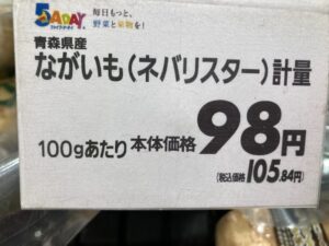 そんなアレコレと攻め系のキャッチコピーの中に突然混ざっていた「ひっそり人気です」も、ちょっとウケました。すっかり商品のコピーに興味しんしんモードになっていたら、別のスーパーの八百屋さんに「ながいも(ネバリスター)」というブランド名が・・・