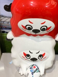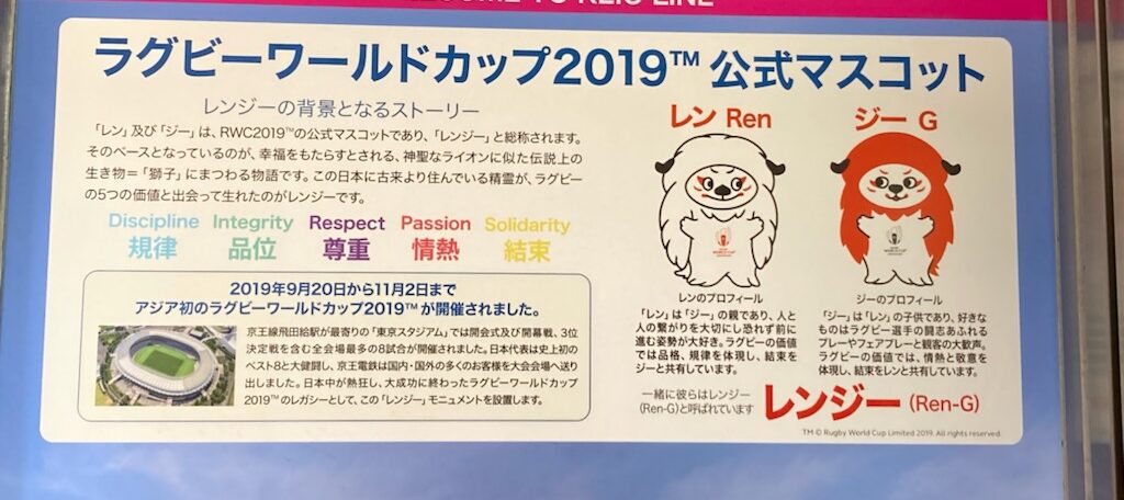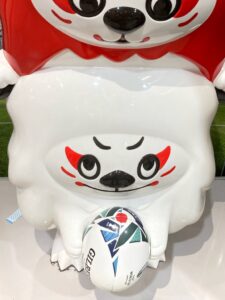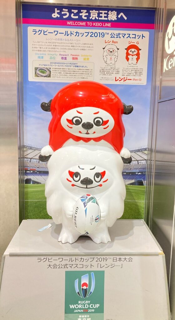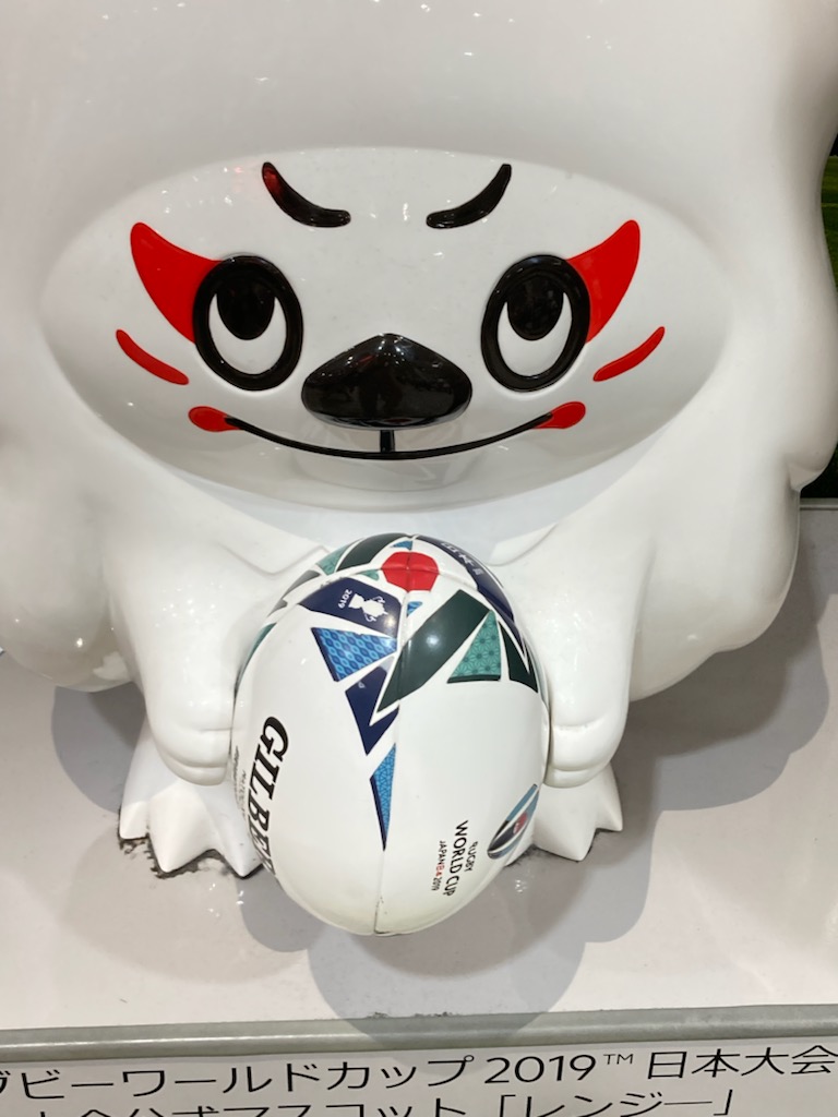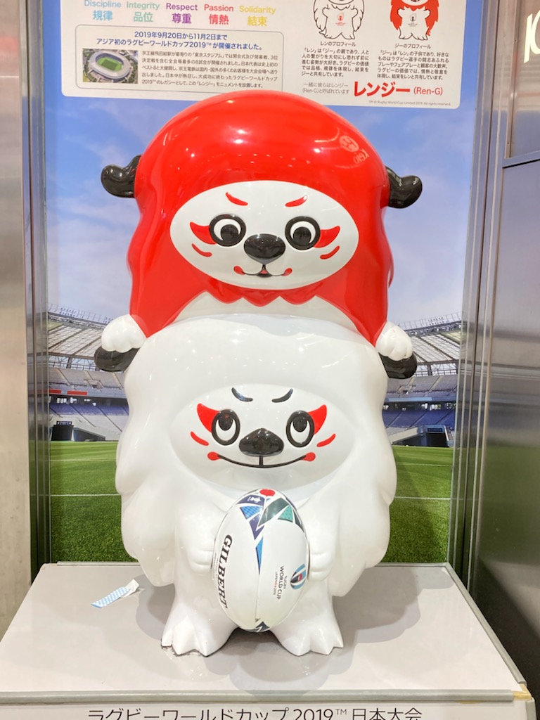 そんなことを思い出しながら歩いていたら、🏉ラグビーのワールドカップ2019の日本大会の公式マスコット=レンジ―を見つけました!Σ(゚∀゚ノ)ノキャーこの時、北見公演ツアーの帰りに飛行機で、日本代表選手たちと一緒になって、間近にすれ違ったり挨拶したりしたんだよー!チームは北海道で最後の調整をして東京に戻るところ。全員すっごくカッコよくてキラッキラしてオーラもビンビンで、輝いていました。それでその年はラグビーを見まくったんだっけ🥰一度会うと、全然見え方や感じ方が変わるのがよーくわかりました。(笑)連獅子からきてるらしい、レンとジ―のコンビのマスコットって書いてあるね。偶然、和の文化のこととラグビー日本代表チームに出会ったことを思い出せてラッキーな一日でしたなり🙋