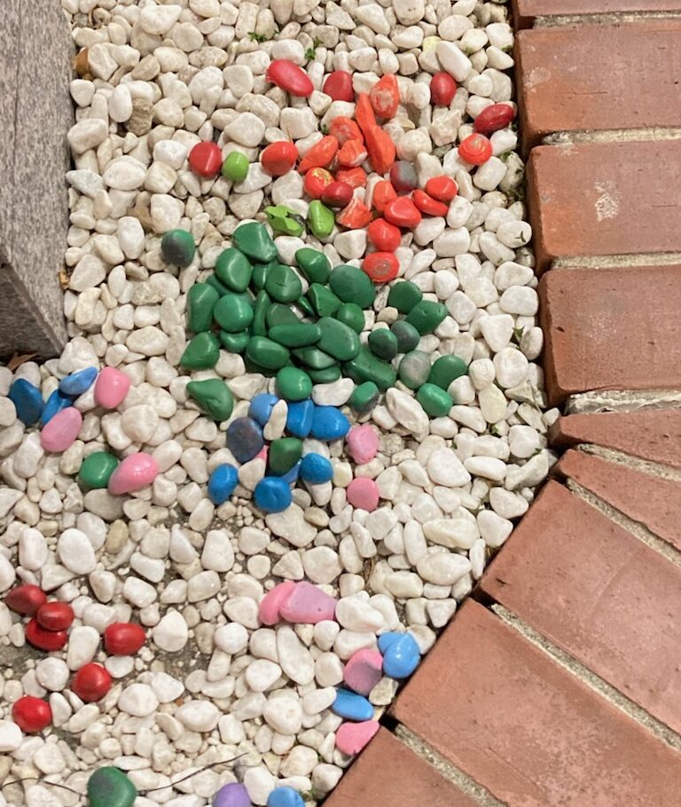 もっとよく見るとあちこちに散りばめられている💜パープルや💚グリーンや💖ピンクや💙水色や💛黄色のハートのほとんどは、たった2個のカラー玉砂利だけでハートの形になってる!!!ワーオ😄👏👏👏🌈🌈🌈左端の緑とオレンジで描かれているモノが何なのかわどうしてもわからないんだけど、みんなはわかる❓❓❓もしかしたらまた学校帰りの小学生たちが動かして形が変わっちゃってるのかな?もう一回見に行けたら行ってきたいけど、バレンタインデーまであと2日しかないから、行けなかったらごめんね~😚おやすみなさ~い🌕
