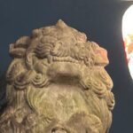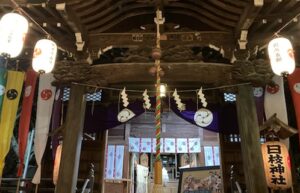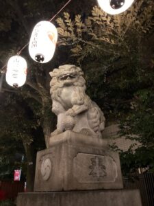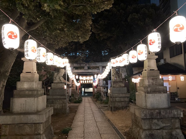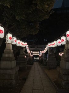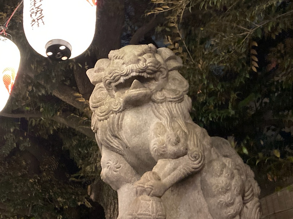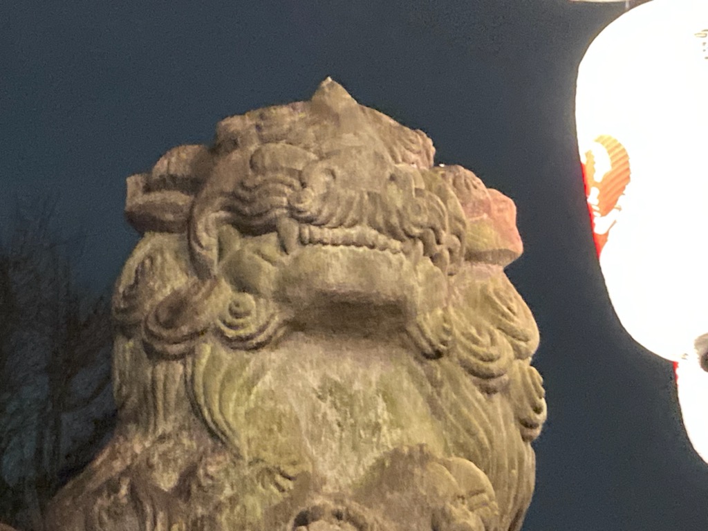入口が小さくて、鳥居をくぐると石畳の道がずうっと奥の方まで続き、両側には提灯が柔らかい光で並んでいました。その一番奥に、社殿がありました。鈴を鳴らす時に使う紐?縄?の色がなんと!ラスタカラー!!!🙀