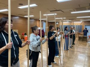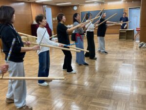 棒の先を身体から離して持ち上げたり遠く平行にキープしたりするのも、ありとあらゆる筋肉を使うので、完全にブートキャンプのトレーニング状態になっちゃうし。。。5枚目の写真みたいに胸の前でバッテンにして打ち合わせる動きは今回初めて登場したんだけど、これもいい音を出すのがすごく難しいし、胸筋・背筋・腕のオール筋肉、肩の筋肉や僧帽筋、関連して足腰の支えの筋肉などなど全身運動なのでありマッスル。
