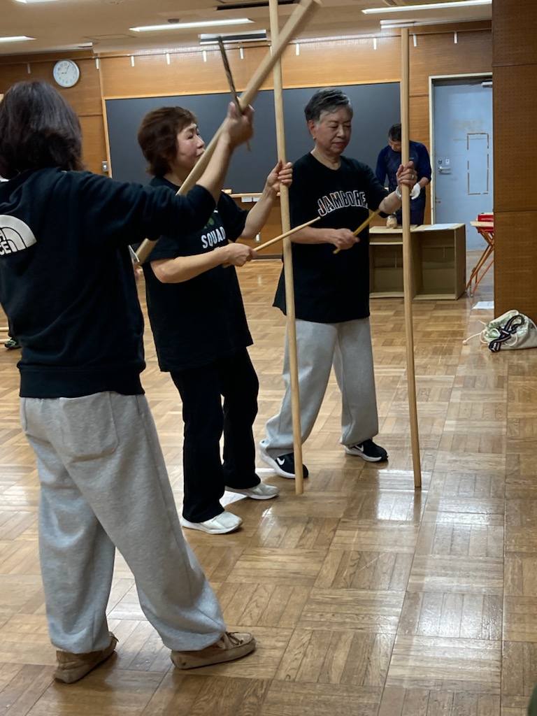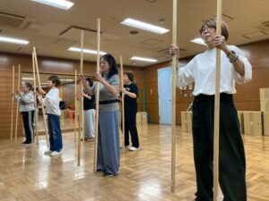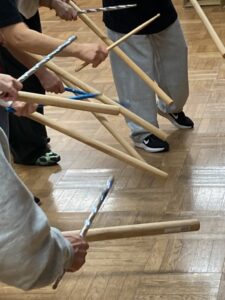 棒の先を身体から離して持ち上げたり遠く平行にキープしたりするのも、ありとあらゆる筋肉を使うので、完全にブートキャンプのトレーニング状態になっちゃうし。。。5枚目の写真みたいに胸の前でバッテンにして打ち合わせる動きは今回初めて登場したんだけど、これもいい音を出すのがすごく難しいし、胸筋・背筋・腕のオール筋肉、肩の筋肉や僧帽筋、関連して足腰の支えの筋肉などなど全身運動なのでありマッスル。