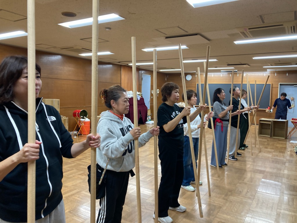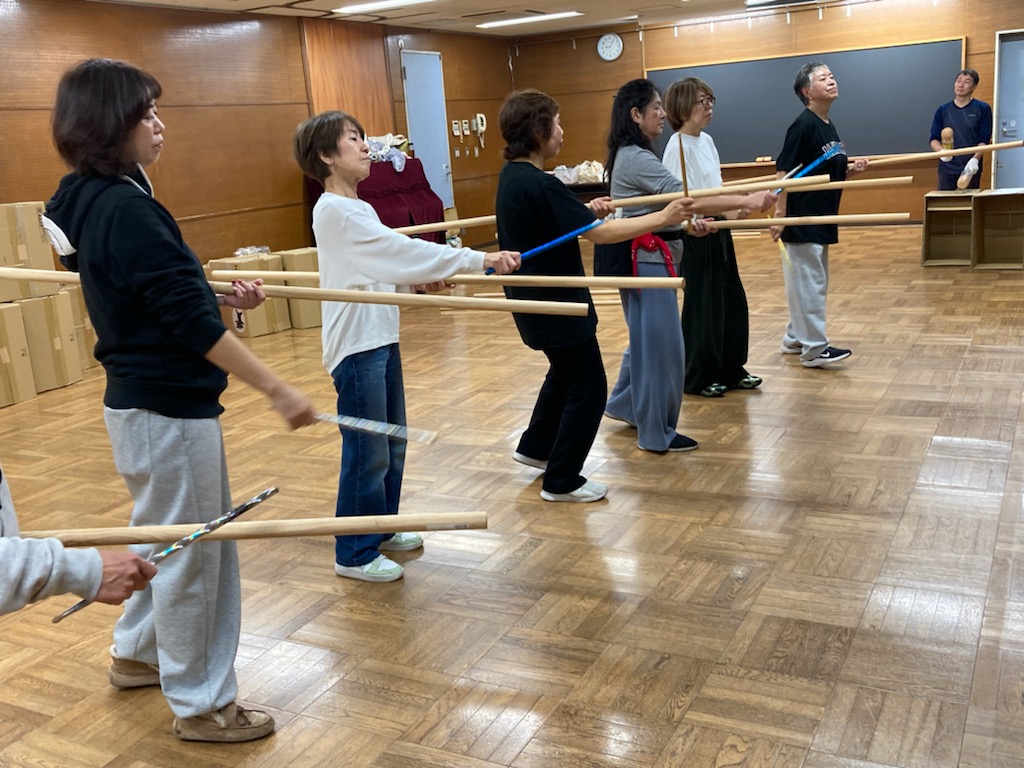 その一つが棒を楽器に見立てて使う曲です。いくつか、かなり凝った作品があるけれど、今回の曲はひとりが長い棒を2本持って演奏するシーンが長くて、しかも先端を持ち上げた状態でポジションを移動したり、棒の先をバッテンの形にしながら「カン♬」と打ち合わせたりする振り付けがあるので、実はめちゃキツイのだ~~😱💦💦💦まず、実際に棒を持ってみないとわからないキツさだニャ~🙀💦💦💦細い棒をずうっと握って上げたり下げたり、振り回したりしているだけでも、握力が持たなくなって、だんだん握っている手の中から棒がすべり落ち始めるんです。