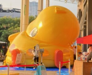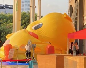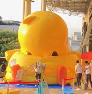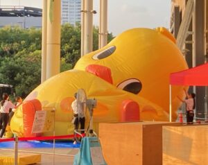 そうなのでありマッスル。頭だけ見てると(/ω\)イヤン(/ω\)イヤンしてるだけだけど、目の高さもどんどん低くなって地面に近くなってるでしょ?周りを囲んでいる白いシャツブラウスに黒パンツの女性スタッフも見えるかニャ?😸❓❓女性スタッフが2~3名でバルーン布?に手を出しては整えていました。
