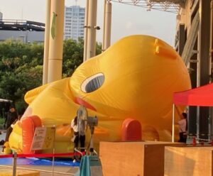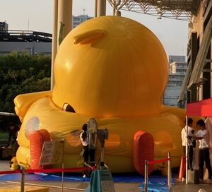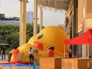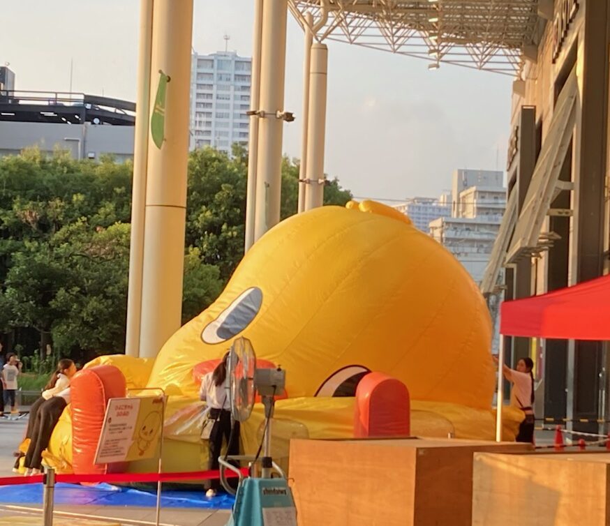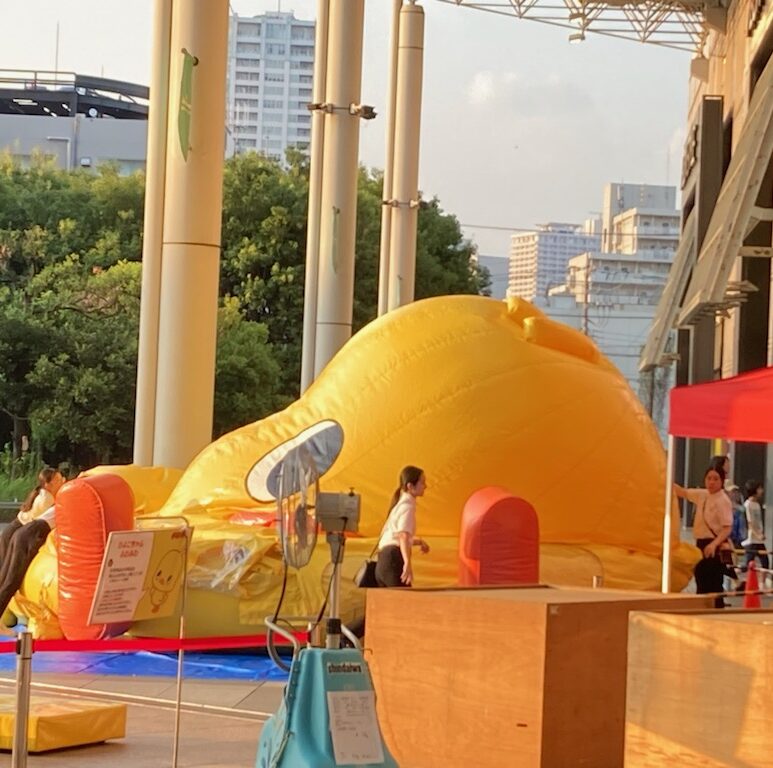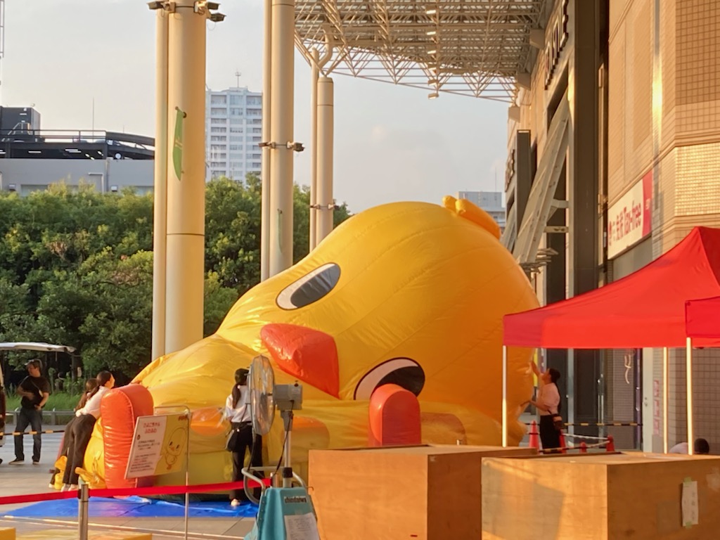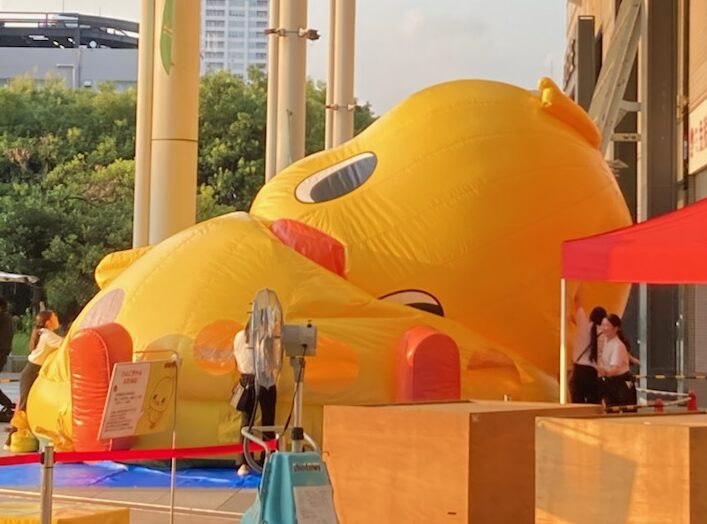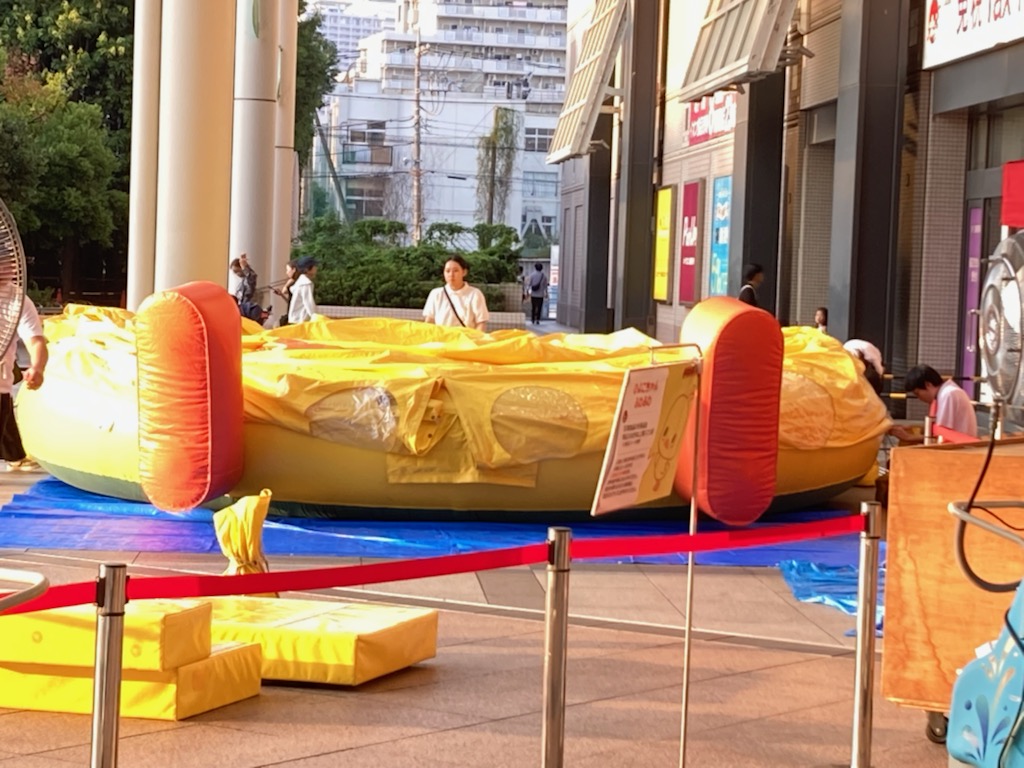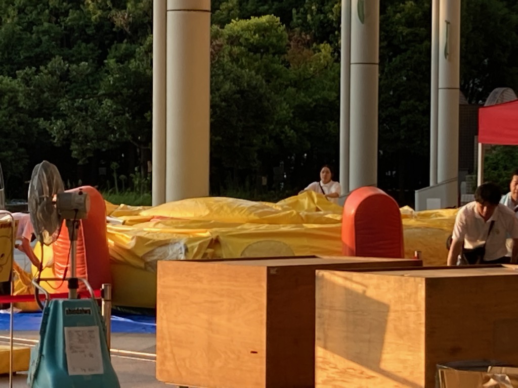 そうなのでありマッスル。頭だけ見てると(/ω\)イヤン(/ω\)イヤンしてるだけだけど、目の高さもどんどん低くなって地面に近くなってるでしょ?周りを囲んでいる白いシャツブラウスに黒パンツの女性スタッフも見えるかニャ?😸❓❓女性スタッフが2~3名でバルーン布?に手を出しては整えていました。