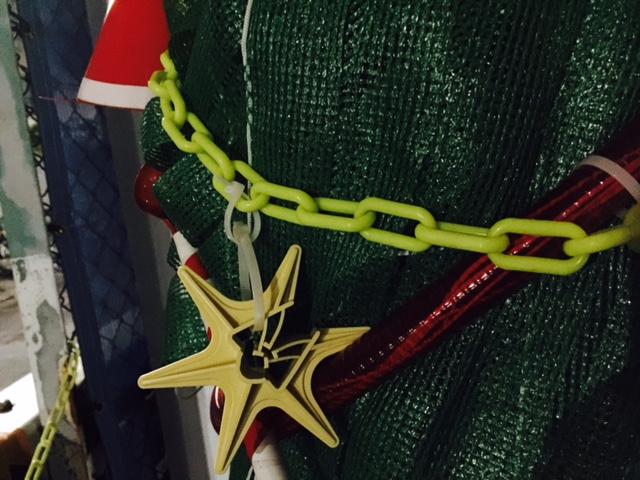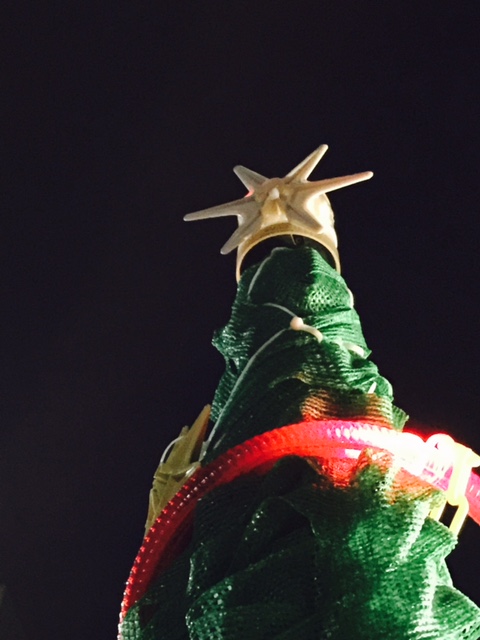 大きな重たいシートをこんなふうに裾の方をきれいに畳み込んでいる感じとか、上の方に向けて円錐形に作りあげる感じはもう、何とも芸術的ですニャ。てっぺんの🌟星飾りは鉄筋スパーサーって言うんだって🐶初めて知りましたなり。この星飾りはツリーのあちこちにも飾ってありました。
