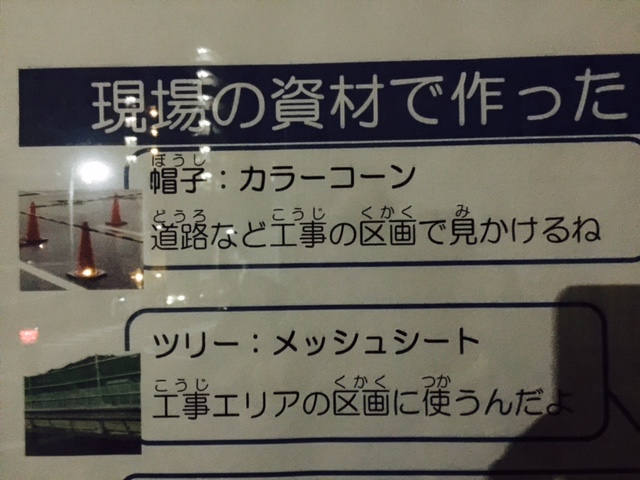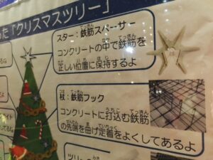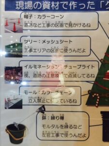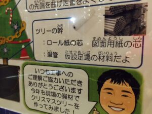 そして、縁の下の力持ちでツリーを支えているのも、資材でした!徹底してますです(⋈◍>◡<◍)。✧♡黒い鉢は、練り樽という、左官工事で使うものなんだって。そしてツリーの幹は、ロール紙の芯と単管で出来てるって書いてあります。あれ?「今年も現場の資材でクリスマスツリーを作ってみました!」って書いてある?!前から作ってるんだね?全然知らなかったΣ(・□・;)今年、出会えてラッキーだったな🙌(*´▽`*)