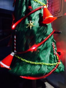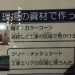 2021年、今年のMy No.1クリスマスツリー🎄<その2>です👋👩そう!このクリスマスツリーは全て、現場の資材で作ってあるんです✨✨✨謎解きはすぐ横の壁に張ってあるパネルに全部書いてありました(*´▽`*)💖🎅サンタの帽子は赤いカラーコーンにアクセントカラーの白の蓄光テープ。それからよく見るとわかるけど🎄クリスマスツリー本体も、なんとグリーンのメッシュシートを丁寧に巻きあげて、円錐形のとんがったモミの木に仕上げてるんです。写真だと分かりにくいかもしれないけれど、形に整えるのはかなり大変だったんじゃないかな(≧▽≦)
