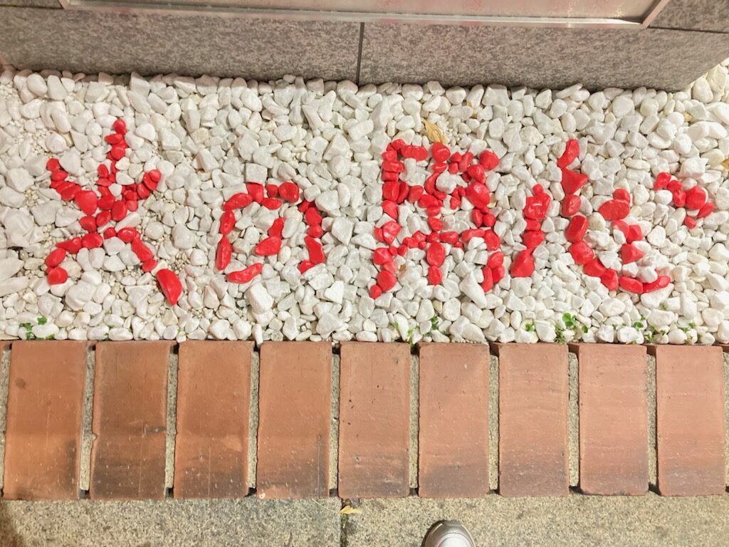 久しぶりに見た🚒消防玉砂利アートの標語・・・👆ズバリ!⭐「火の用心」🔥でした。白い玉砂利のキャンバスにお習字さながらの力強い真っ赤な文字だけのシンプルなデザイン。