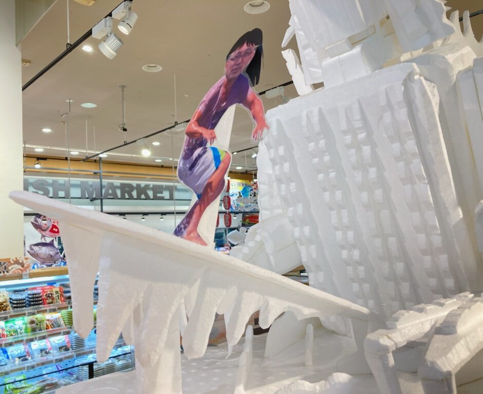 発泡スチロールディスプレイのサーファ姿のカチョーさん、ロン毛はかつらか❓