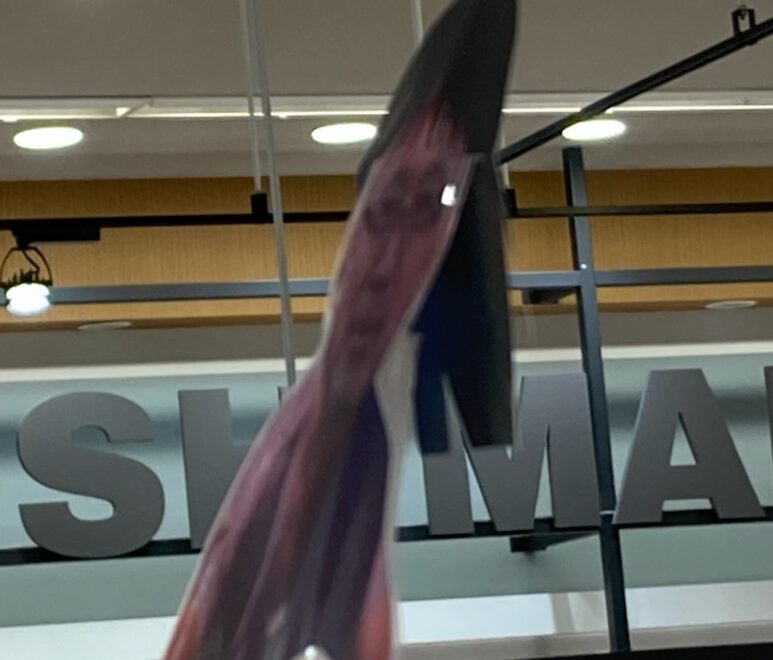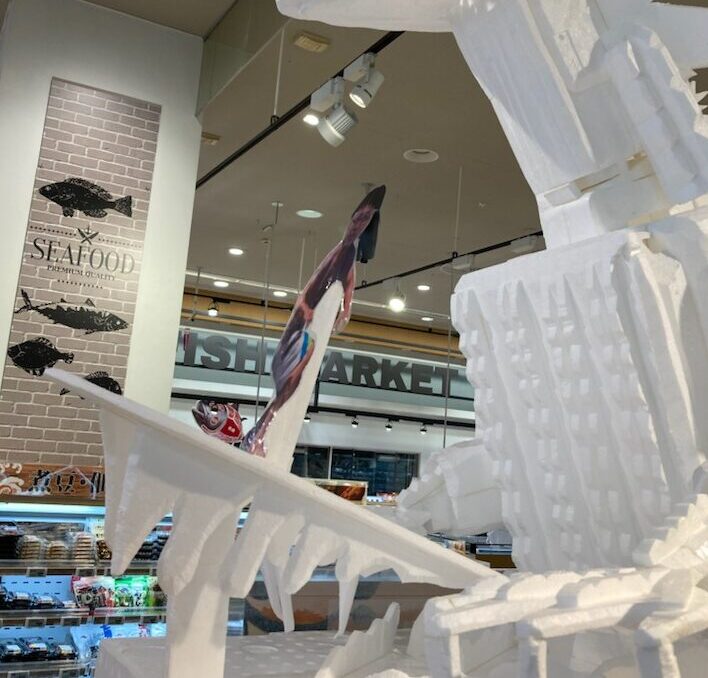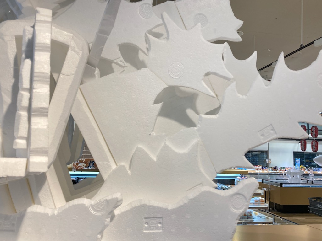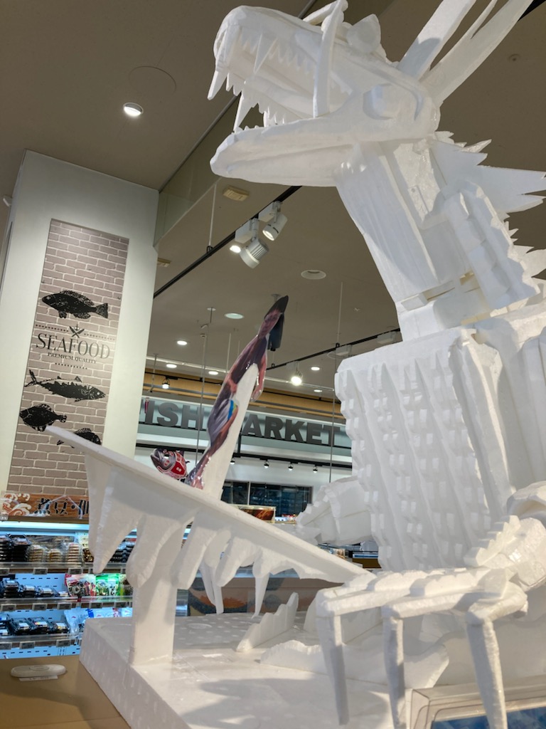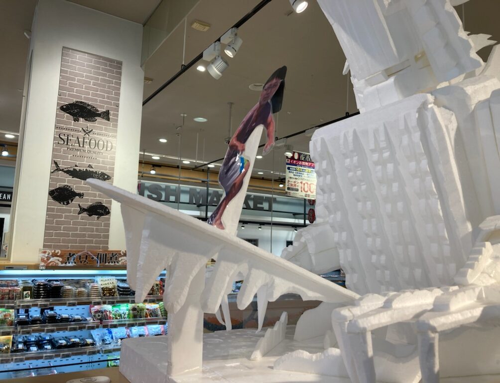 この前UPした発泡スチロールディスプレイの力作の🐉龍にサーフィンしているカチョーさんが🏄突然加わっていた話、覚えてるかな?あの時は、カチョーさんのアップの写真をとる余裕がなかったので、気になってたの。🌴🌺👋😎あと、カチョーさんが乗っているのがサーフボードだったのかもハッキリわからなかったし、🏄その乗ってるサーフボードらしきモノが前からあったかどうかも、すごく気になってたんだ~ヾ(≧▽≦)ノ