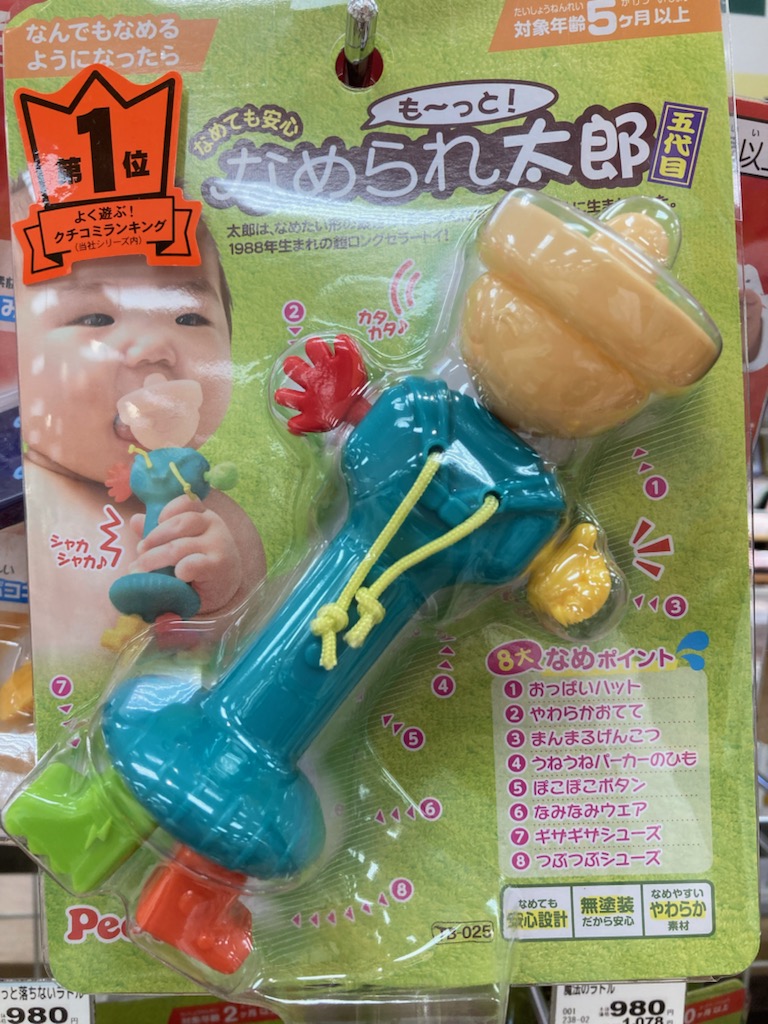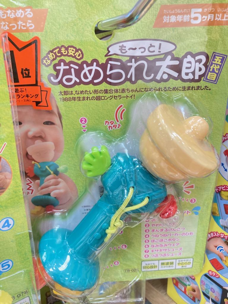 久しぶりに有明方面に行く用事があったので、風邪やコロナ予防対策にマスクをして昼間から出かけました。🌞お天気は晴天~もちろん暑い🤣昼の屋外のマスクってこんなに大変だったっけ?😳・・・去年まではかなりマメにマスクをしていたにもかかわらず、めちゃキツク感じた~😷仕事柄、コロナには絶対罹患したくないので、最初に騒ぎになった頃からかなり長い間、人がいるところではマスクを付けていた系のMariなので慣れてるはずなのにね💦💦💦早くコロナや百日咳やe.t.c.e.t.c.の流行が収まって欲しいデッスル✋✋💃💃💃ところで、何かいい音がしたりカワ(・∀・)イイ!!モノがないかなってたまにオモチャ売り場をのぞいていたら、🎇🎇超インパクティ~🌟なオモチャを発見してしまいました「もーっと!なめられ太郎」って書いてある👶赤ちゃんのための知育玩具。みんな知ってた?🙀ニャンと1988年生まれの超ロングセラートイなんだって。ポップにも書いてあったし、今調べたらやっぱり説明書きに書いてあった。全然知らなかったにゃ~😸💦