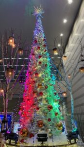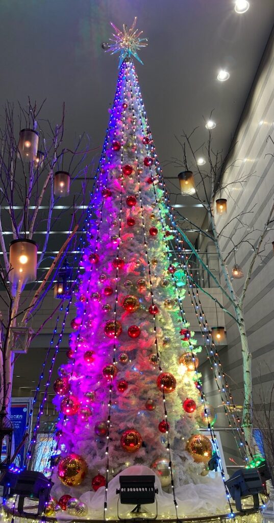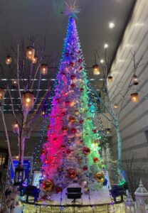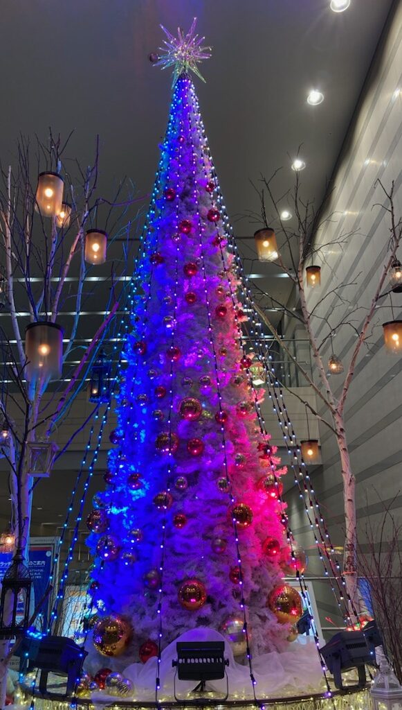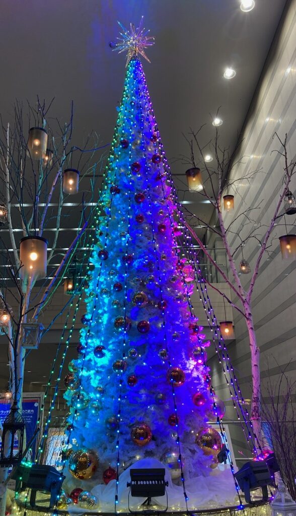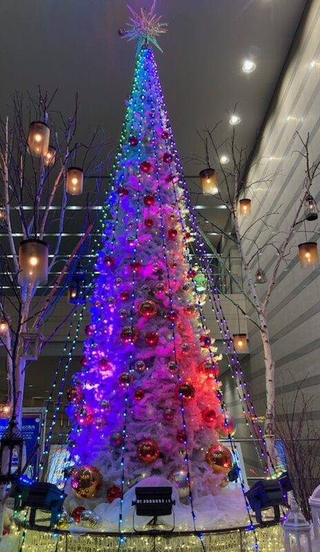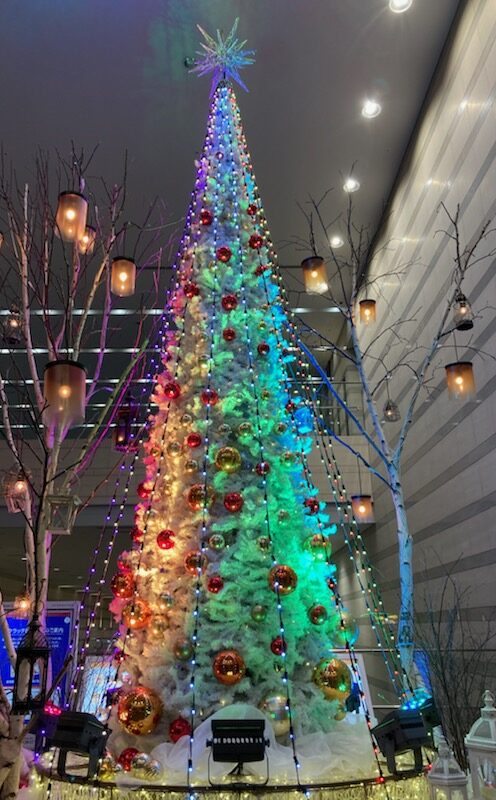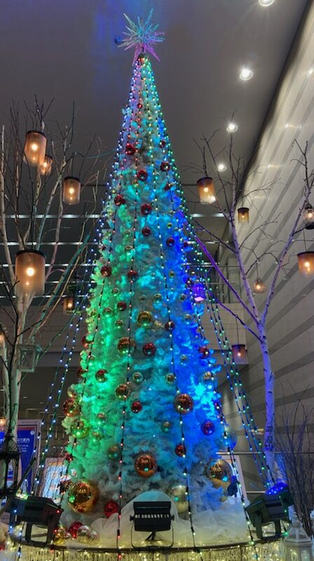 🌟🌟さて!音楽に合わせて色が変わるクリスマスツリーがファンタジックだったので、みんなに見せたくて写真を撮りました(⋈◍>◡<◍)。✧♡📸どう?なかなかでしょ?実は、ツリーそのものは真っ白で、ライトをあてることで色を変えているの。このレンボーカラー変化になるまでは、白に淡いグリーンの状態とか淡い赤の状態が音楽に合わせて延々と続くので、待ちきれずに帰ってしまったこと4~5回。