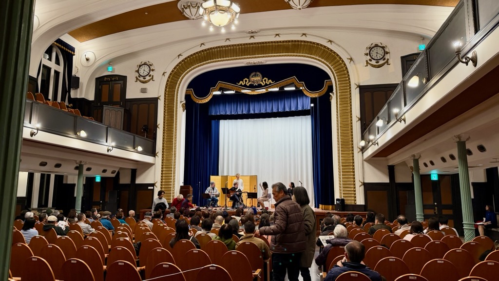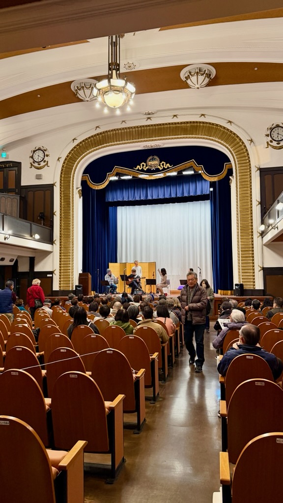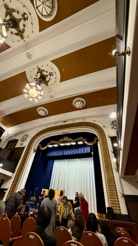 落語会の会場も、見てちょーだい(^o^)丿天井の高さと時代を彷彿させる趣のある素晴らしいデザイン。😍💖💖💖おトイレも小さい正方形のタイル張りで。全体の中央に床掃除した水を履ける排水溝口あったり、便器?(へんな話でごめんね😺💦💦💦もレトロ感たっぷり。でもどこもピカピカに磨き上げられていてすごくきれいなの。U字の便座(何の話をしてるんだ?)もクリーム色という徹底したレトロ感、いや、明治大正ロマン感👘👢💖。