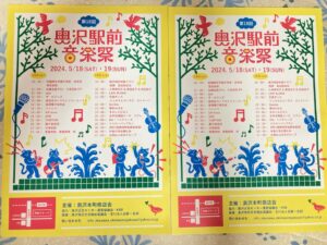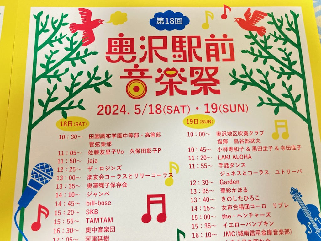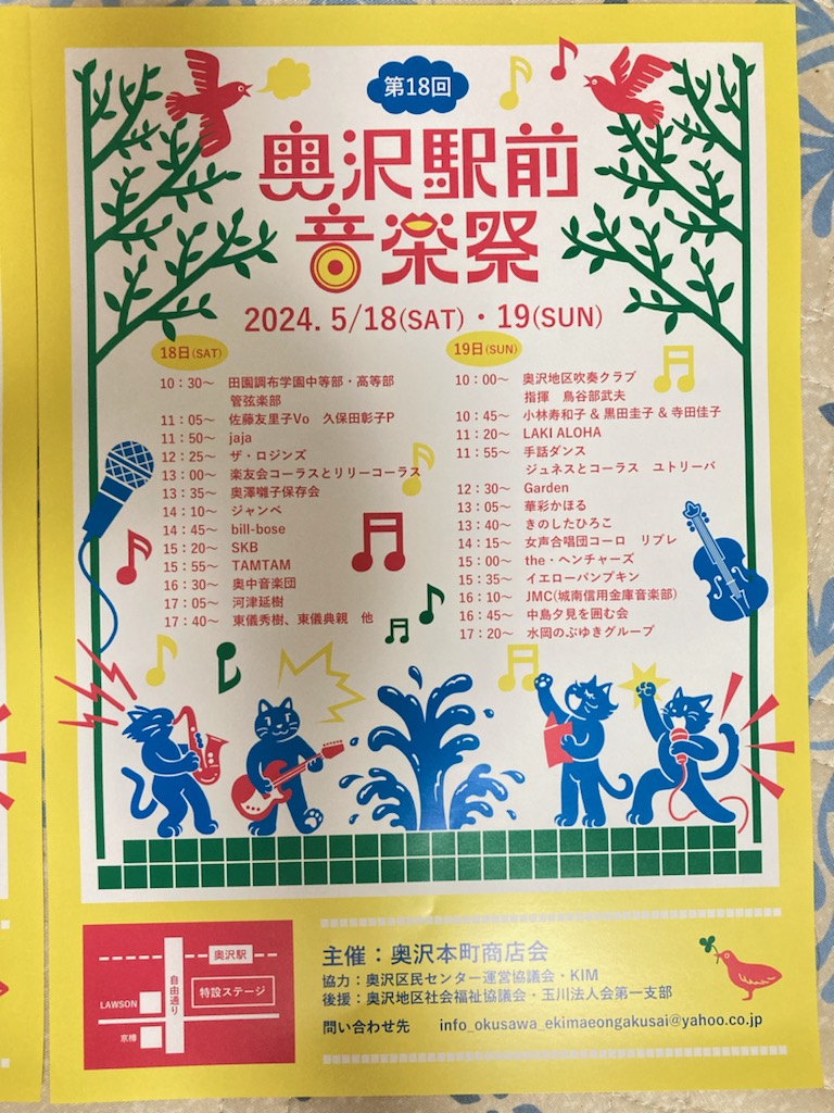 📯ジャジャジャジャーン🎉奥沢駅前音楽祭のチラシ登場でーす。👏👏👏🎶近くのみんな、5月18日(土)は奥沢駅前音楽祭で会おうね💖🙋<👼TAMTAM>🎸も<📦JUMBE=ジャンベ🎵>も待ってるよー🤗🎵🎶🎤🎸🥁🧴