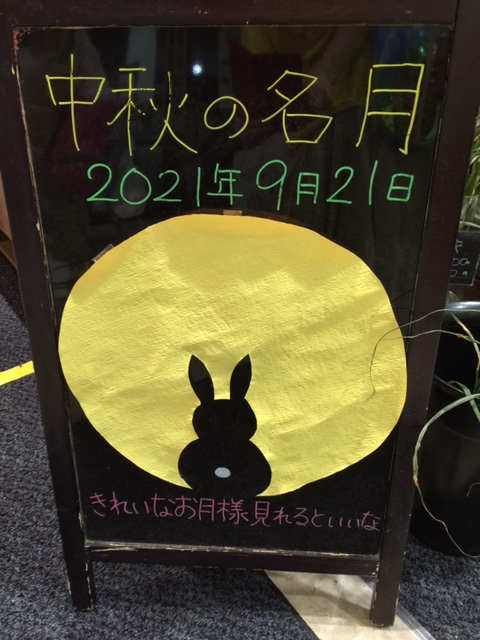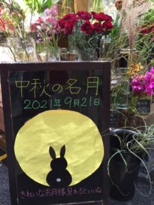 🌕わぁ・・・・・今夜の月は煌々として、眩しいくらいですぴょん🐰あしたの十五夜、中秋の名月は、8年ぶりの満月なんだって🐇🐇🍡お天気がいいなら、絶対に見逃したくないですぴょん🐰この連休は、スーパーも毎日おはぎやお団子のコーナーが広くなって、お月見団子や月見バーガーまでいっぱい並んでますぴょん。そして、いつもは売れ残るのに、夜行くとな~~~んにもなくなってる。お花屋さんも立て看板まで作って盛り上げてるし。