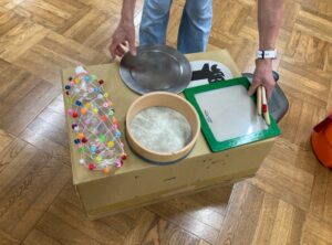 早めに文化センターに到着したら1Fロビーに誰もいなくて、すぐにHiroが到着。「まだ誰も来てないなら、鍵の借り方わからないから、とりあえず倉庫から楽器だけ出んどく?」なんて話していたら、B1の方からドンドコ音が聴こえてきました。「あれ?時間間違えたかな?😆💦」「えっ?7時じゃなかった?」取り急ぎB1のリハーサル室に行くと、ものすごく真面目な段ボール演奏のサウンドが中から聴こえてくる。