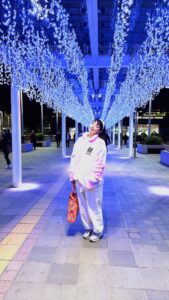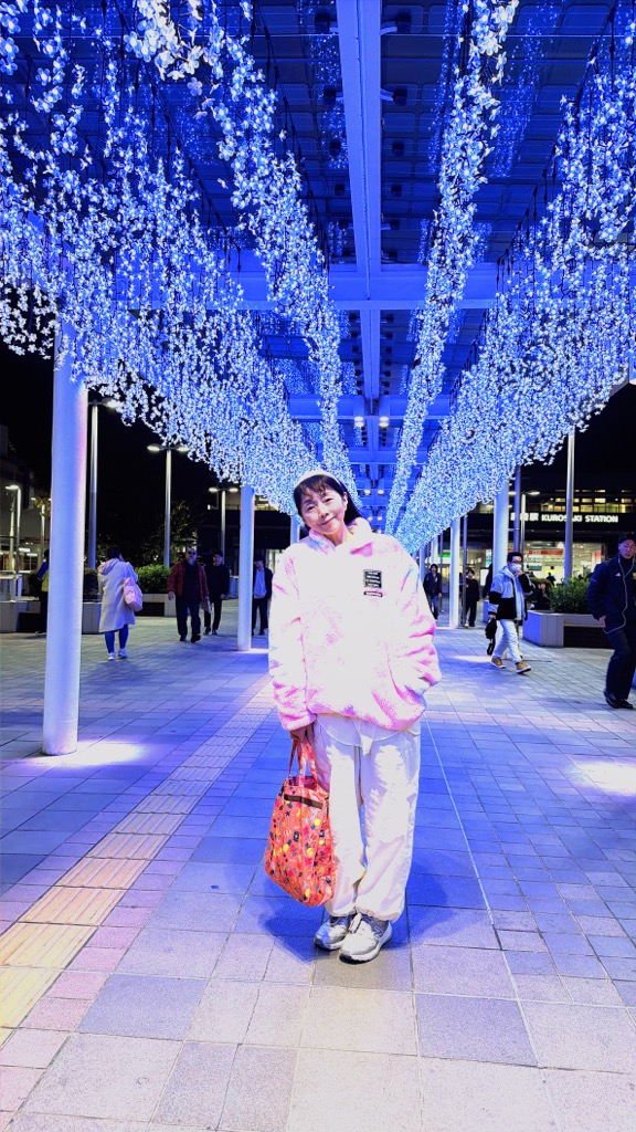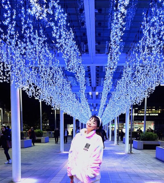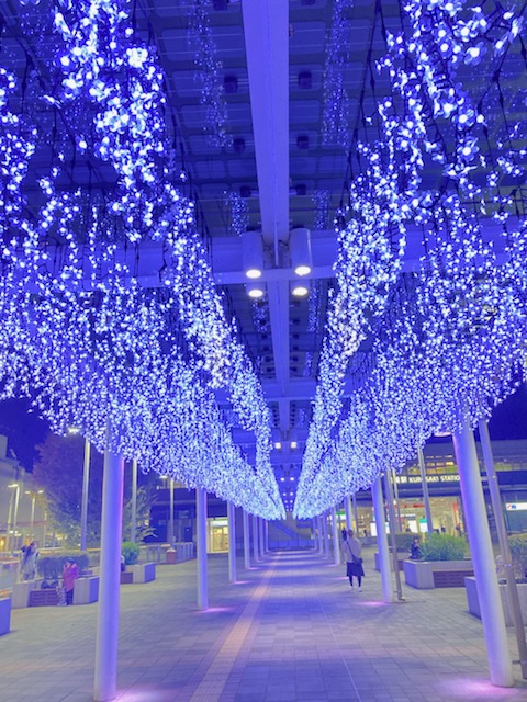 上からブルー系のライトがたくさん下がっているイルミネーションのアーケード。ひとつひとつの小さなライトが桜みたいなお花の形をしたイルミネーションがとってもきれいだったので記念写真を撮ってみましたー。
