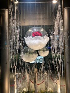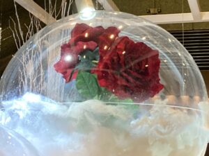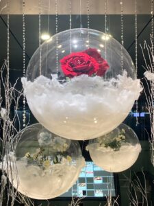 もったいなーーーい😿🌊😿仕方なくこぼれた分は片付けて、最後に掃除機で吸い取って濡れたペーパータオルで拭き拭き。部屋は何となくいい香りがしているので、残り香を楽しんでいまっする。🌹🌹🌹容器はもちろん、外蓋をキュキュッと締めました。ところが、別の部屋で掃除機を使ったら、バラの香りがふわぁ~~💖💖💖しまった!またこぼしちゃったのかな?!!!と焦って周りを見ても、容器はどこにもない。おっかしいなぁと思いながらまた掃除機で掃除を始めると、🌹ダマスクローズぅ~な香が・・・そうなんです、掃除機にパウダーが残ってるせいだったんです。とは言っても、掃除機もとっくに掃除した後なんだけど、まだ残ってるみたいです。ダイソンは分解掃除が出来ないから、香りが自然に消えるまで、お掃除の度にダマスクローズの香に包まれるMariです。でも、いい香りって、たしかに癒されるよね(●´ω`●) 写真は先日見かけた変わったディスプレイ。カプセルに何が入ってるのかなって思ったら。🌹大きな薔薇の造花でした。バレンタインデイを意識したのかしらん???