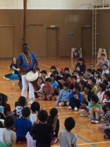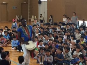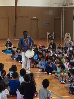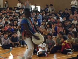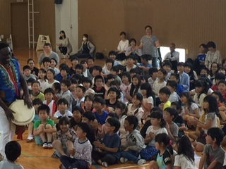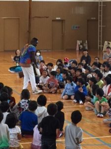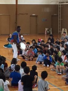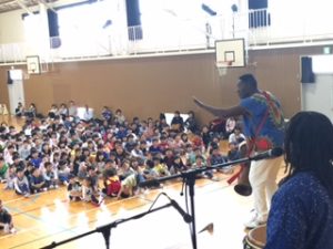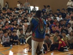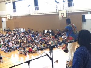 ただ、どこから登場するかはヒミツなの。学校の体育館が会場の時は体育館の作りや、お天気などによって演出が変りまっする。なぜなら、ジャンベは本皮太鼓なので雨に濡れたらOUTだから。それから、冬の寒い日は、腕丸出しのこの衣装だと凍えてしまうので外で15分も待機できないの。それでも、みんなをドキドキワクワクさせたりビックリさせるのは大好きなBBは、かなりの寒さでも「ガンバッて外で待つよ」と言ってくれるんだけどネ。