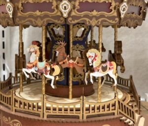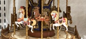 メリーゴーランドに乗り込んでから、まず、どの馬に乗るか選ぶのがすっごく大事で、いつも真剣に歩き回って選らんでいたのを思い出しました!まず大きくて白い馬!あとはたてがみが長くて金色がいっぱいで、鞍の色が派手でゴージャスなのも大事。つかまるポールもピンクとかイエローのねじり棒みたいなカラフル系じゃないとね!👍🌟場所的には外側の馬の方が疾走感があっていいんだけど、両側に他の馬が上下するのも楽しいんだよね😊だから一番外側か外からちょっとだけ内側の馬が好きでした。それから、外の景色を見るのも爽快だけど内側の鏡を見ると馬たちが映っていてたくさんの馬の群れが走ってるみたいなので、乗っている間は片手でしっかり棒につかまりながら、あちこち見まわしたり、たてがみを撫でたり、なりきって盛り上がる!💪😎✨✨Σ(゚∀゚ノ)ノキャー突然思い出しちゃった~~~そうそう!この作品よりはかなり豪華で大きなメリーゴーランドだったけれど、最近のはどんな感じなんだろう???
