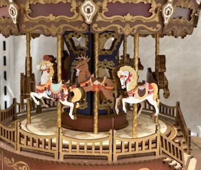 動くものも多数あるんです~😊💖🐎メリーゴーランドも☕ティーカップもこんなにステキで、しかもくるくる回るんだもん、びっくりぽんでしょ?くるくる系では、椅子を紐で宙づりにしてグルグル回転してブンブン遠心力で振り回す「スウィングライド」が一番激しくて、写真もブレブレにしか撮れませんでした📸😹💦💦💦地球儀も歯車が嚙み合いながら回転してました。2枚目の写真のチェロは、弓が左右に演奏しているかのように動いてました。歯車が見えているのが、レトロとSFの混じったファンタジーな世界観。